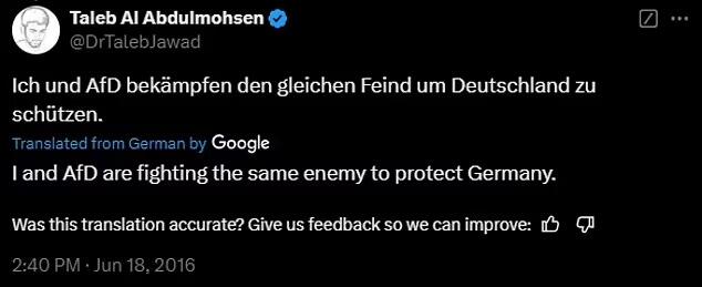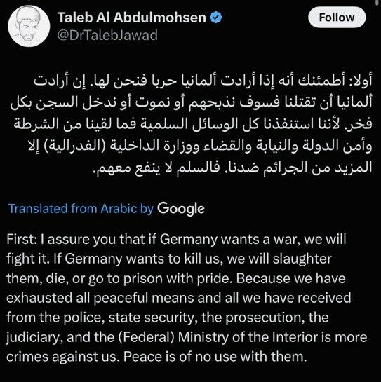Another tweet from 2006 after Taleb arrived in Germany suggests hostile intent against his new home: