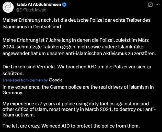 German authorities cite posts by the suspect on X showing support for the AfD and popular anti-mass immigration figures.
