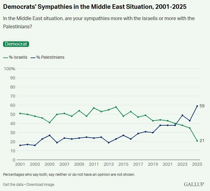Democrats also sided with the Israelis until 2022, when roughly equal shares said they sympathized with each side. Since then, Democrats have supported the Palestinians.