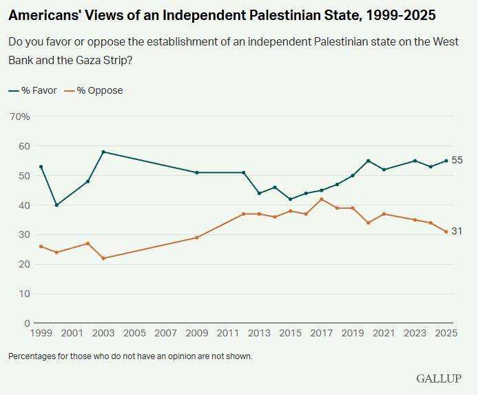 For years, a core tenet of Middle East peace proposals has been the so-called “two-state solution,” which would entail the creation of a Palestinian state. Gallup has measured Americans’ views on this since 1999. Since then, more Americans have supported than opposed the establishment of an independent Palestinian state in the West Bank and the Gaza Strip, and that continues today. Currently, 55% are in favor and 31% opposed, while 14% do not have an opinion.