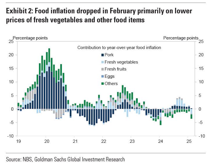In February, China’s headline CPI inflation fell to -0.7% yoy from +0.5% yoy in January,driven by lower food prices and tourism-related services prices partly driven by an earlier-than-usual Lunar New Year holiday. Goldman estimates suggest the earlier holiday (January 29 vs. February 10 in 2024) reduced year-over-year headline CPI inflation by 0.7% in February. In month-on-month terms, headline CPI inflation fell to -3.5% (annualized, seasonally adjusted) in February (vs. -1.7% mom s.a. annualized in January).