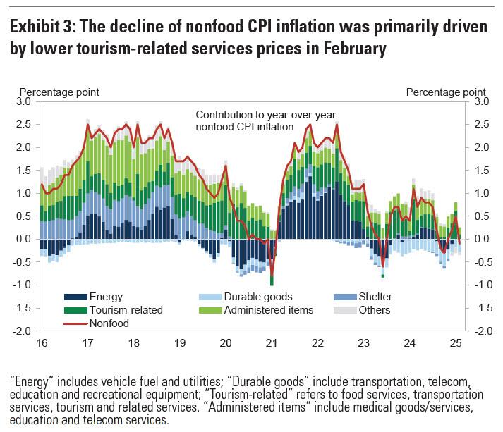 Non-food CPI inflation moderated to -0.1% yoy in February from +0.5% yoy in January. The fall of nonfood CPI inflation was mainly driven by lower tourism-related services prices in February, due to the distortions from timing of Lunar New year holiday.