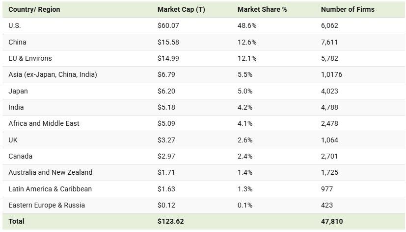 The value of the U.S. stock market is roughly equal to all other regions combined, encompassing 6,062 firms collectively valued at $60.1 trillion.