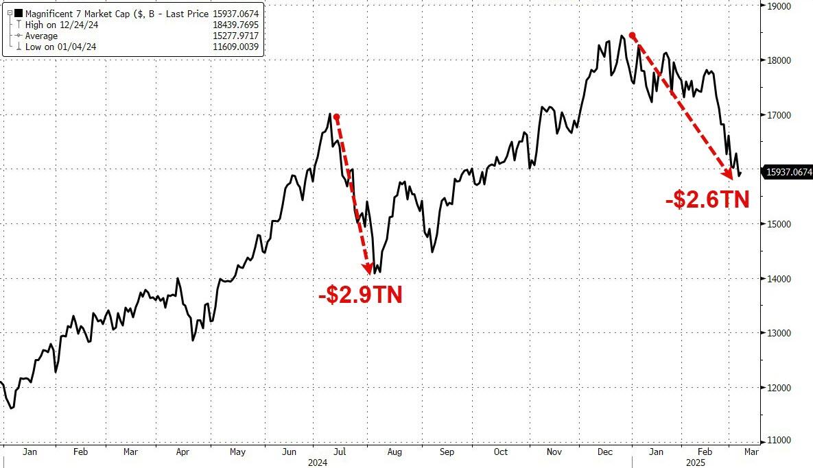 At the end of December 2024, the market capitalization of the Magnificent Seven – Apple, Microsoft, Alphabet, Nvidia, Amazon, and Meta Platforms – was over $18.4 trillion, making up almost 30% of the entire U.S. stock market. Last year, these companies fueled more than half of the S&P 500’s returns. This year, it has been the opposite, fueling the downturn as they have lost over $2.5 trillion…