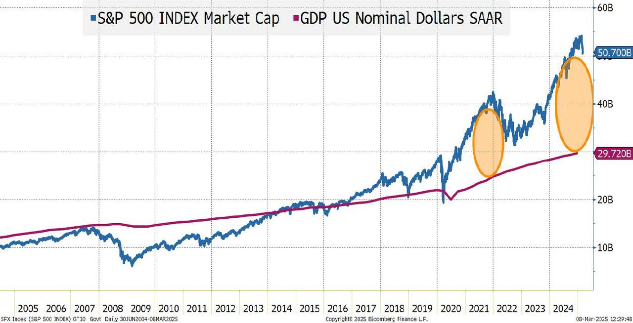I could be wrong (I really don’t pay attention to Buffet), but I think he is often linked to comparing the market capitalization of the S&P 500 with U.S. GDP. There are a number of bears out there who point out this disparity. Many seem to link it to