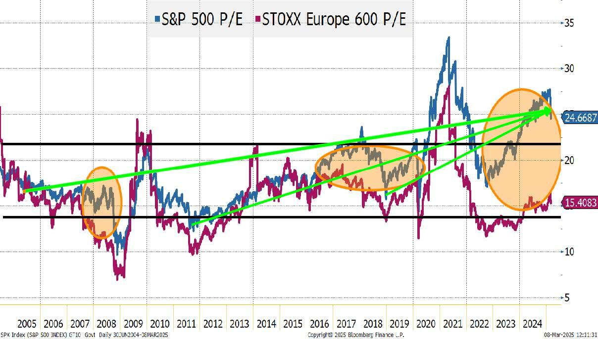 P/E ratios, especially for the U.S., but also for Europe (at least until 2022) have been drifting higher.