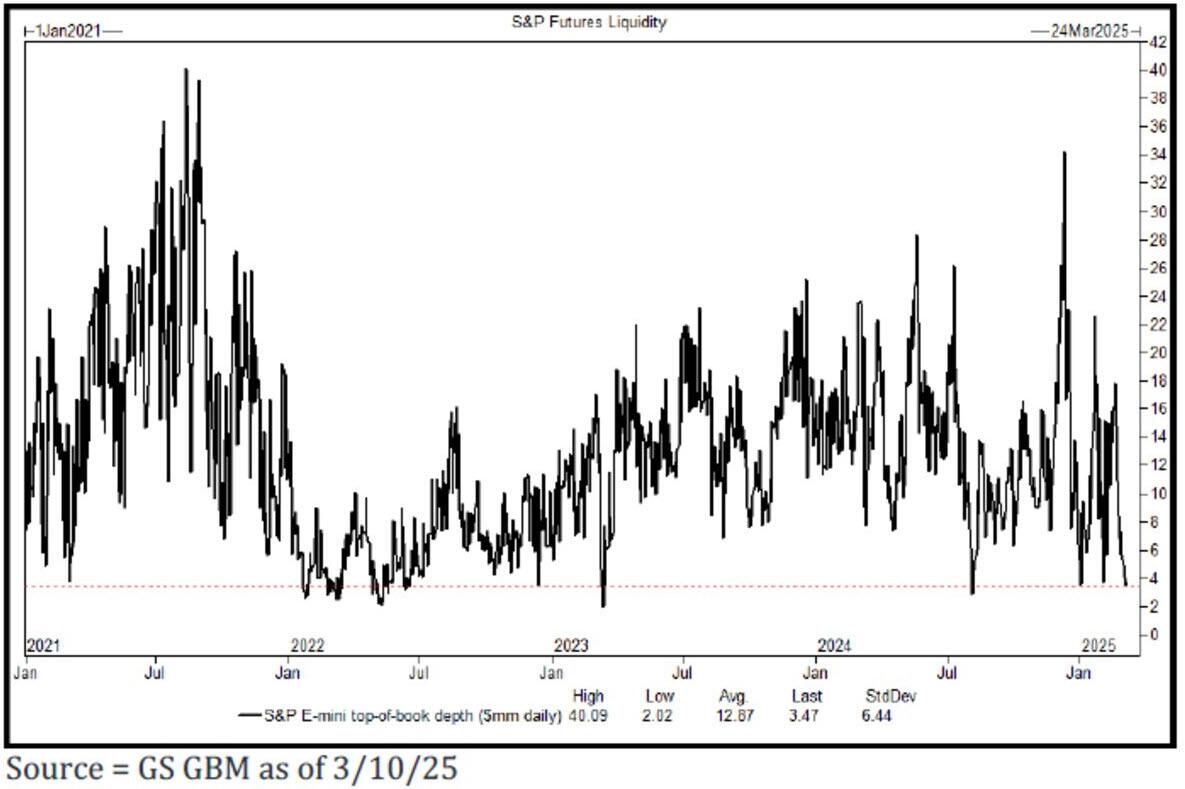All this is leading to positioning being washed out. Fast money CTAs have been offloading stocks at pace and are likely to continue to do so, according to market specialists at UBS and Goldman Sachs. They are modeling CTAs to be sellers of stocks this week in any scenario. The cleansing of portfolios is also having a bigger impact on stocks as liquidity is suffering a meltdown. Goldman Sachs traders note that S&P 500 top of book liquidity — the aggregated best bid and best offer — ticked below $4 million Monday, only around one-third of the average since 2021.