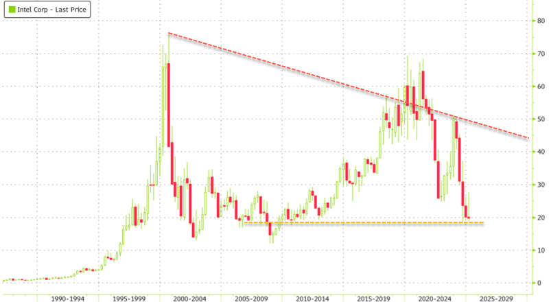Intel shares in premarket trading were up 5.5% but flat on the year despite all the talk in corporate fin press about the one-time chip giant selling partial stakes in its foundries.