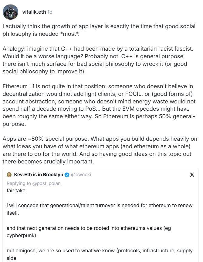 Ethereum co-founder Vitalik Buterin argues it’s Ethereum’s application layer, not its infrastructure layer, where Ethereum needs “good social philosophy” the most.
