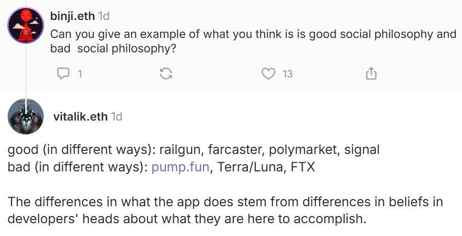 On the other hand, Buterin said the memecoin platform Pump.fun, the collapsed crypto ecosystem Terra, its native token Terra, and the collapsed crypto exchange FTXare examples of bad social philosophy.