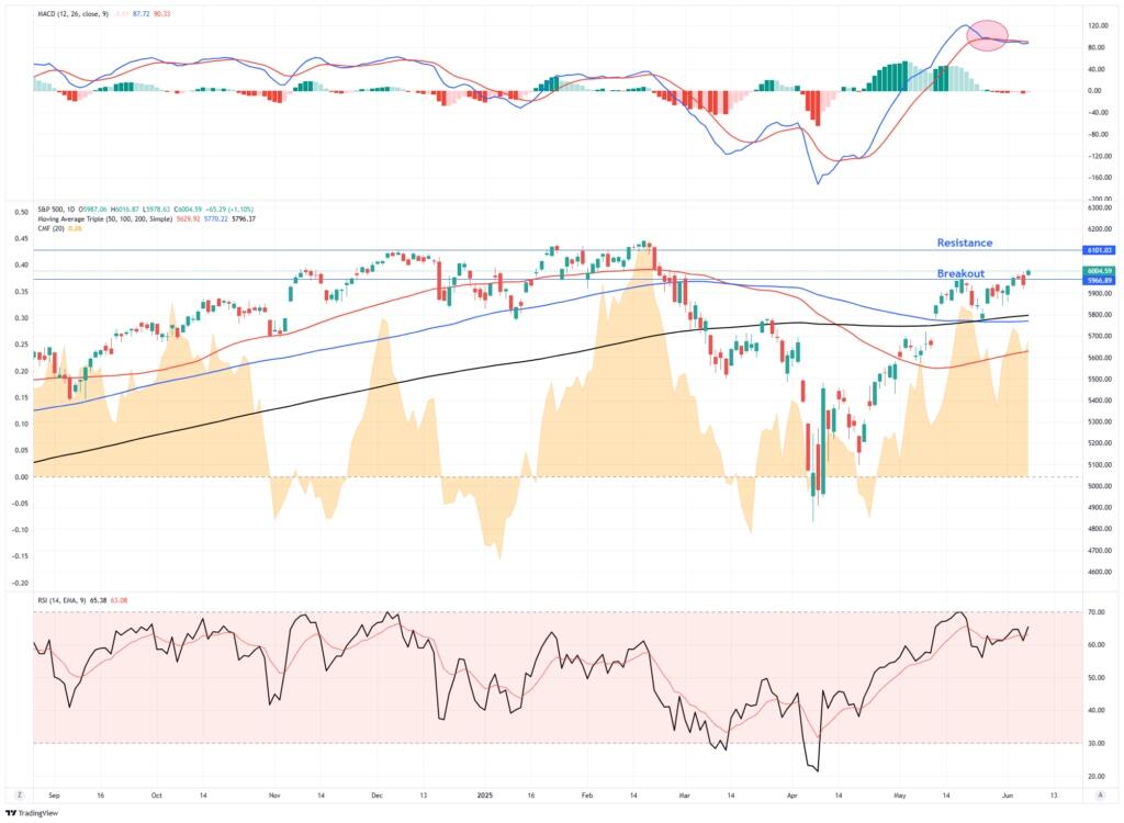 Despite a weakening unemployment report, a spat between President Trump and Elon Musk, a resurgence in the Ukraine/Russia conflict, and remaining tariff uncertainty between China, Europe, and the U.S., the markets continued their bullish ways this past week. Notably, the market broke out of the ongoing consolidation process that has been in place since May 12th. The good news is that bullish breakouts confirm bullish momentum and suggest markets will trade higher into the next resistance level. That next resistance level is at 6100, the previous topping process before the March and April decline.