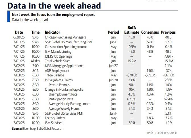 Prepare to be disorientated this holiday shortened week, as payrolls sees a rare Thursday printahead of the Independence Day holiday on Friday, with both JOLTS and ADP labor reports ahead of the Payrolls report. We also have the US ISMs tomorrow and Wednesday, and the various global PMI numbers from tomorrowwhich will give us a good guide to global economic momentum in June.