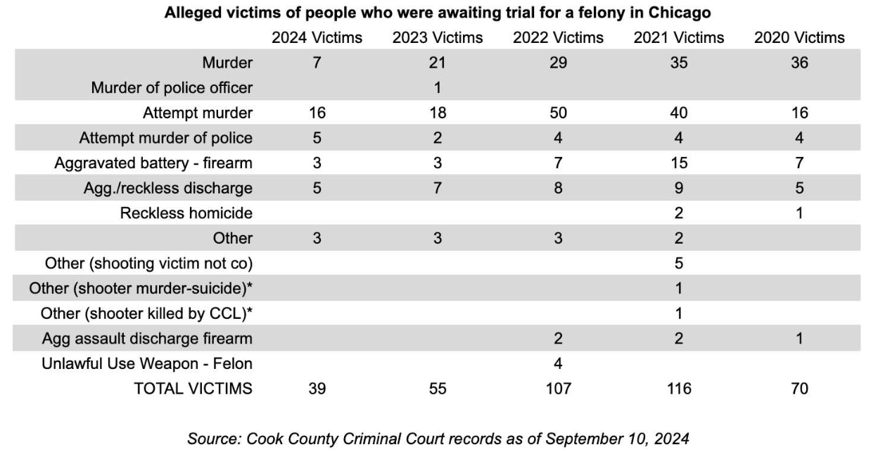 How many offenders in Illinois have been let out before trial due to an undetainable crime and then committed yet more offenses? It’s hard to know, but CWB Chicago in their “not horrible” series has at least compiled a list of individuals accused of killing, shooting, or trying to kill or shoot others while on pretrial release for a felony allegation (see CWB chart below).