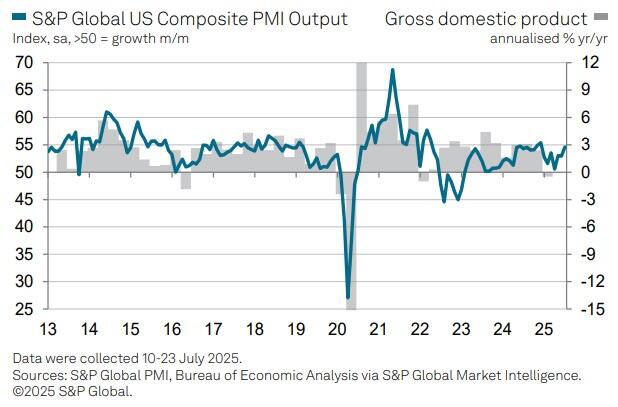 “The flash PMI data indicated that the US economy grew at a sharply increased rate at the start of the third quarter, consistent with the economy expanding at a 2.3% annualized rate. That represents a marked improvement on the 1.3% rate signalled by the survey for the second quarter.