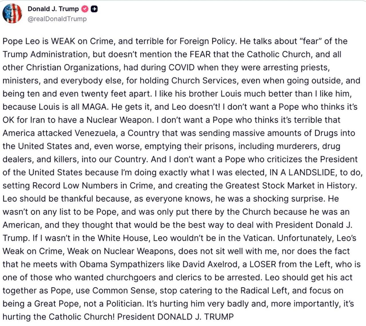 The lengthy Truth Social post was issued by Trump one day after the Chicago-born pontiff stated during a prayer vigil for peace what he characterized as a “delusion of omnipotence” during the Iran war.